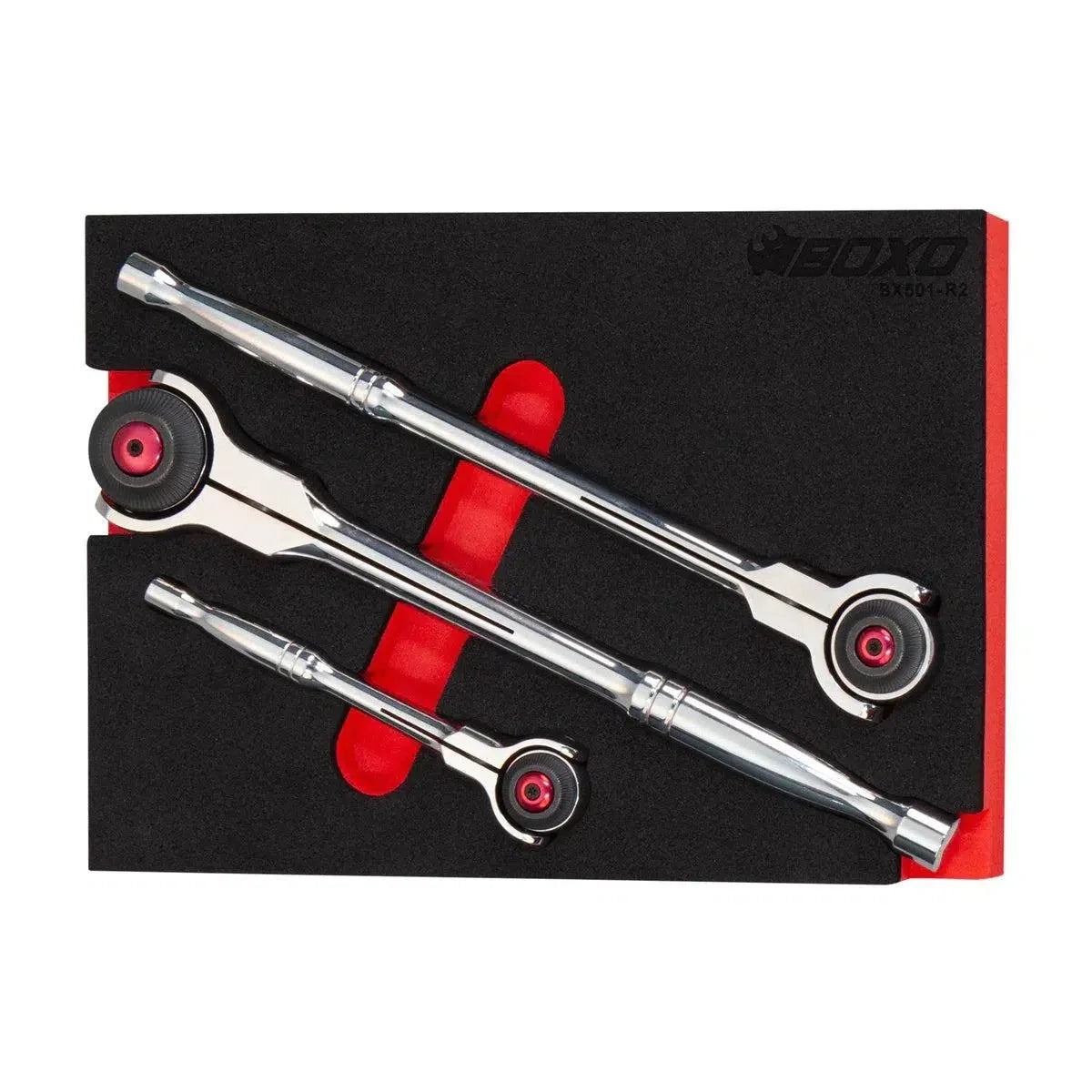 1/4", 3/8" & 1/2" Drive 72T ratchets with swivel head and socket release button. The socket release button in the drive allows sockets to be easily removed even with greasy hands. 72T Ratchet gear set provides low ark advancement of the sockets in tight applications. Modular EVA foam tool storage solution drawer inset is included. SKU: BX501-R2