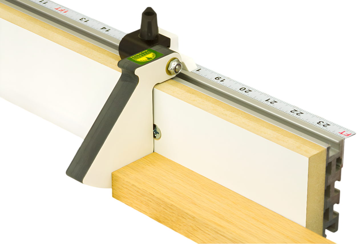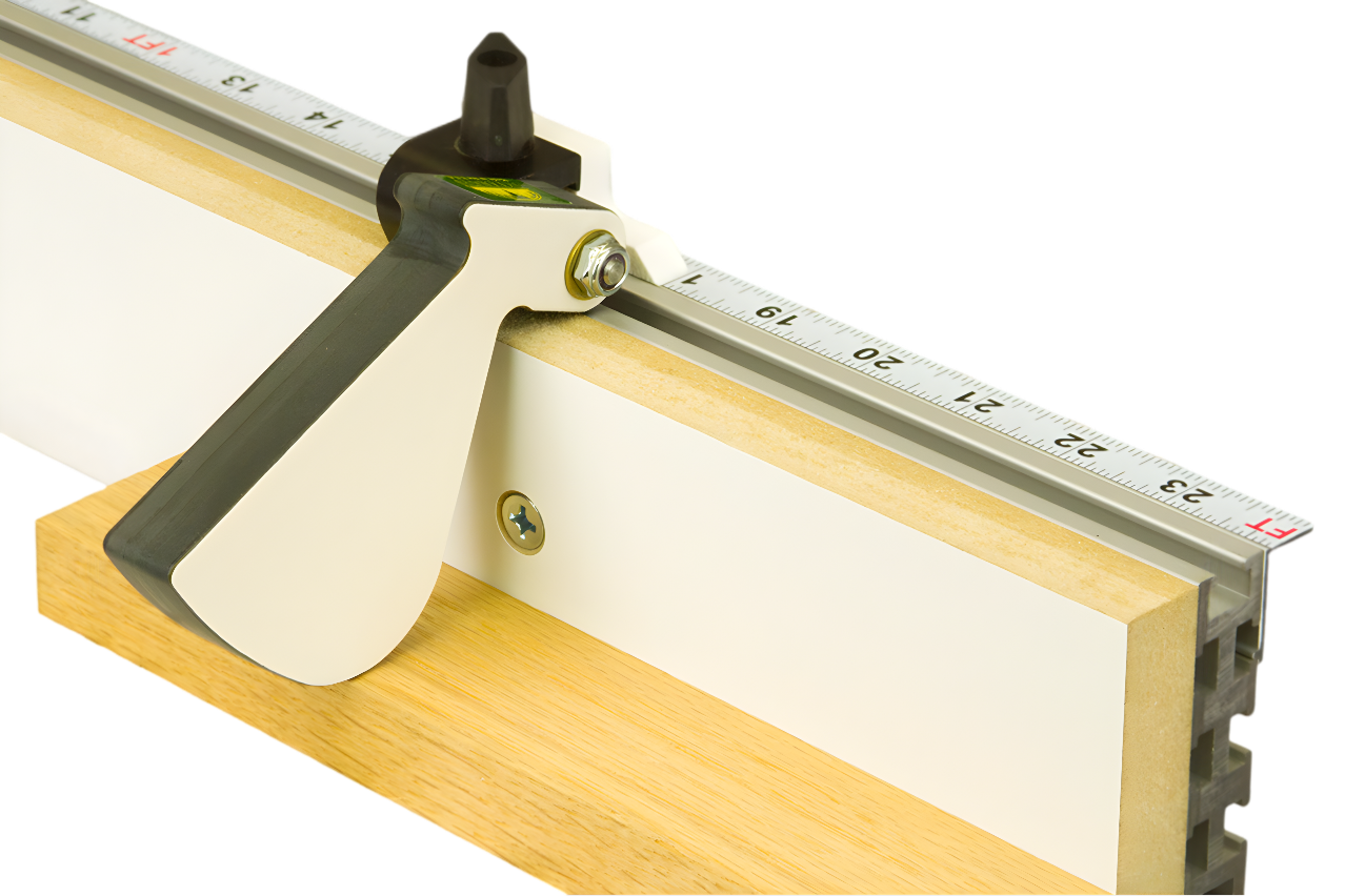 Our Woodhaven 4516 3" Curved Flip Stop system makes everyday repetitive cutting tasks easier. The curved stop attaches to the top of our 3" aluminum extruded 4400 Ultra Track. It features a 3/4" thick phenolic stop arm which can be mounted on either side of the stop block, rotates on a stainless steel shaft, and auto-lifts when stock up to 7/8" thick is pushed against it. It also has an ergonomic finger grip, a cursor designed for use with an optional Ruler Bar (4824, 4836 or 4848) and 3/4" subfence (4424F, 4436F or 4448F, both sold separately), and an optional 4523 Micro Adjuster for fine adjustment (sold separately).