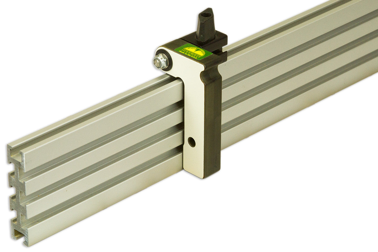 A good stop system is necessary for accurate repeated cuts. Our Straight Flip Stop attaches to the top of our 3" tall aluminum extruded 4400 Ultra Track. The 3/4" thick phenolic Stop Arm can be mounted on the left or right side of the stop block and rotates on a stainless steel shaft. Top finger grip makes it easy to flip arm up. The stop can be adjusted for the flip effort that you desire. The Stop kit includes a cursor and mounting hardware to use with the optional Woodhaven Ruler Bar (Part Number 4824, 4836 or 4848) and 3/4" subfence (Part Number 4424F, 4436F or 4448F), order both separately. Flip Stop includes a mounting hole for shop made accessories, plus our 4517 Stop Extension, order separately, which supports outboard miters. An optional 4523 Micro Adjuster for fine adjustments is also available, order separately.