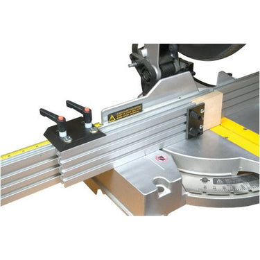 It includes a 12" Ultra Track arm that allows the stop to extend closer to the blade for precise length control, as well as a 3-5/8" Ultra Track section for standard cut-off operations. A quick-attach bracket makes it easy to add a sacrificial scrap block for zero-clearance cutting when needed.