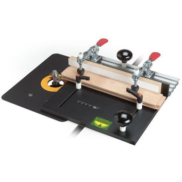> Heavy duty 1/2" phenolic base (11-5/8") will not distort from clamp pressure. Features two 500 lb. Inboard Toggle Clamps to hold stock up to 1-3/4" thick.