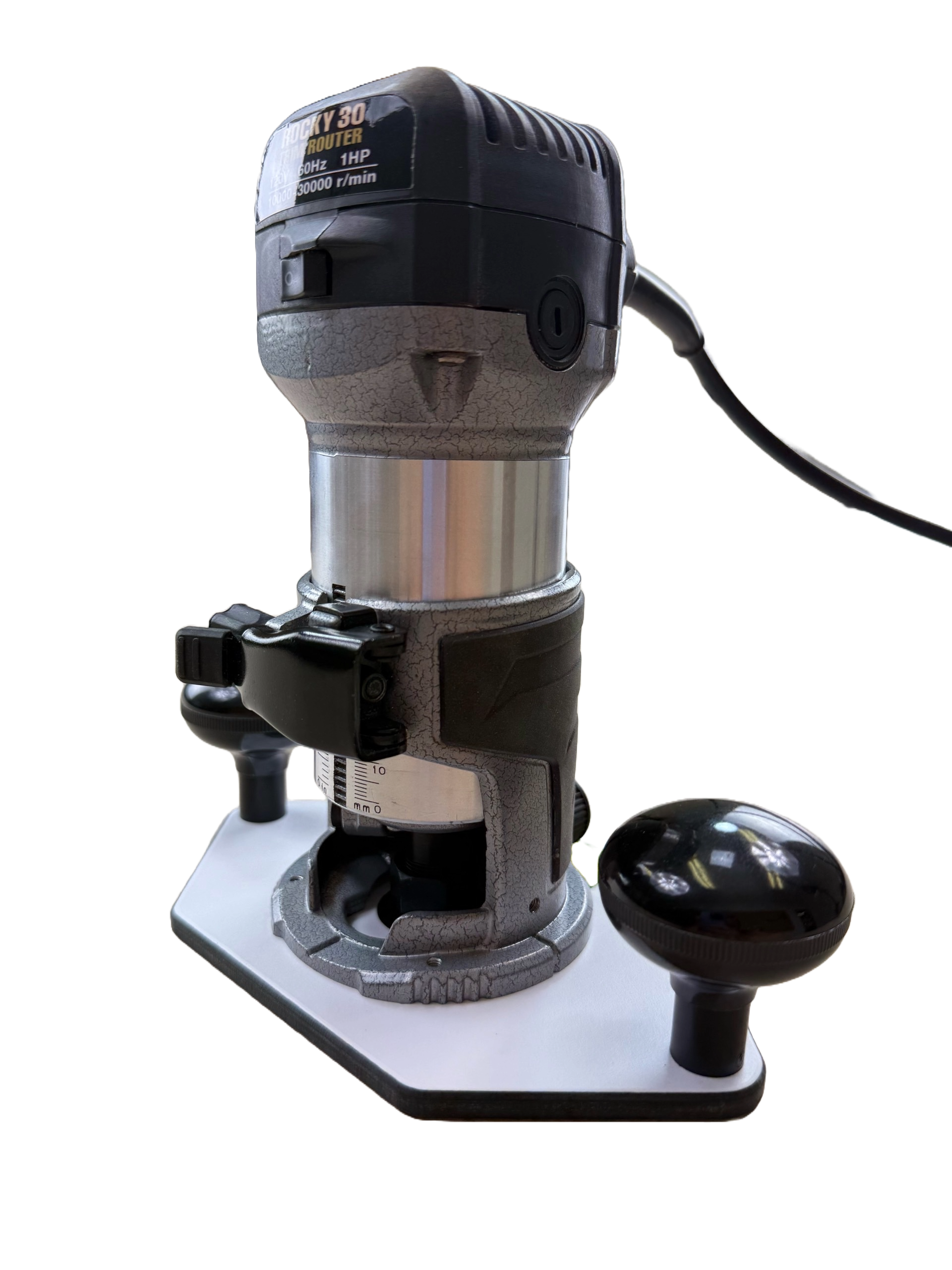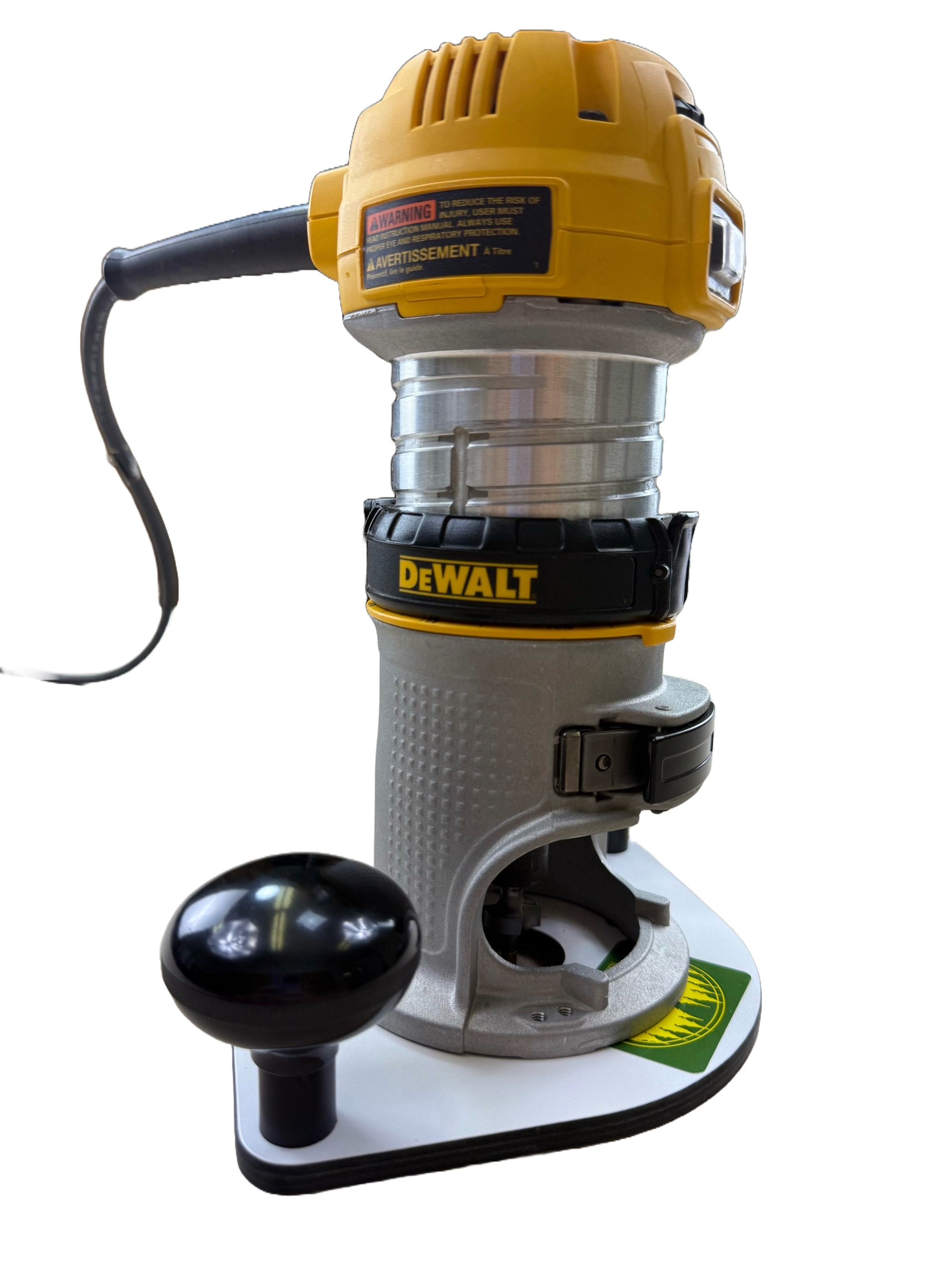 Hand held router baseplate designed for a compact router. Includes two handles for better control and safety. 2" bit hole accepts bigger bits and allows for better visibility. 7mm (1/4") thick white phenolic base plate is 7-3/4" by 5" and includes mounting screws. Our Phenolic Compact Router base plate is more durable than the acrylic plates others sell. See our 8320-8390 Bushing Plates if you need a plate for guide bushings. See our 8325-8395 Offset Plates for safer edge routing. Router not included.