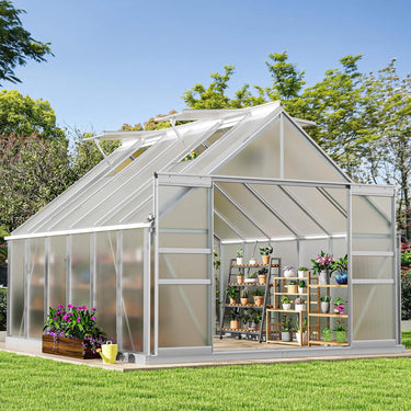 Shield your prized blooms from harsh elements with premium 4mm double-wall polycarbonate panels. These sheets provide superior insulation to keep temperatures steady while filtering out 99.9% of harmful UV rays, ensuring your plants get the light they need without the risk of scorching. Supported by a heavy-duty aluminum alloy frame, this structure stands strong against wind and rain, giving you peace of mind that your garden is safe and secure.
