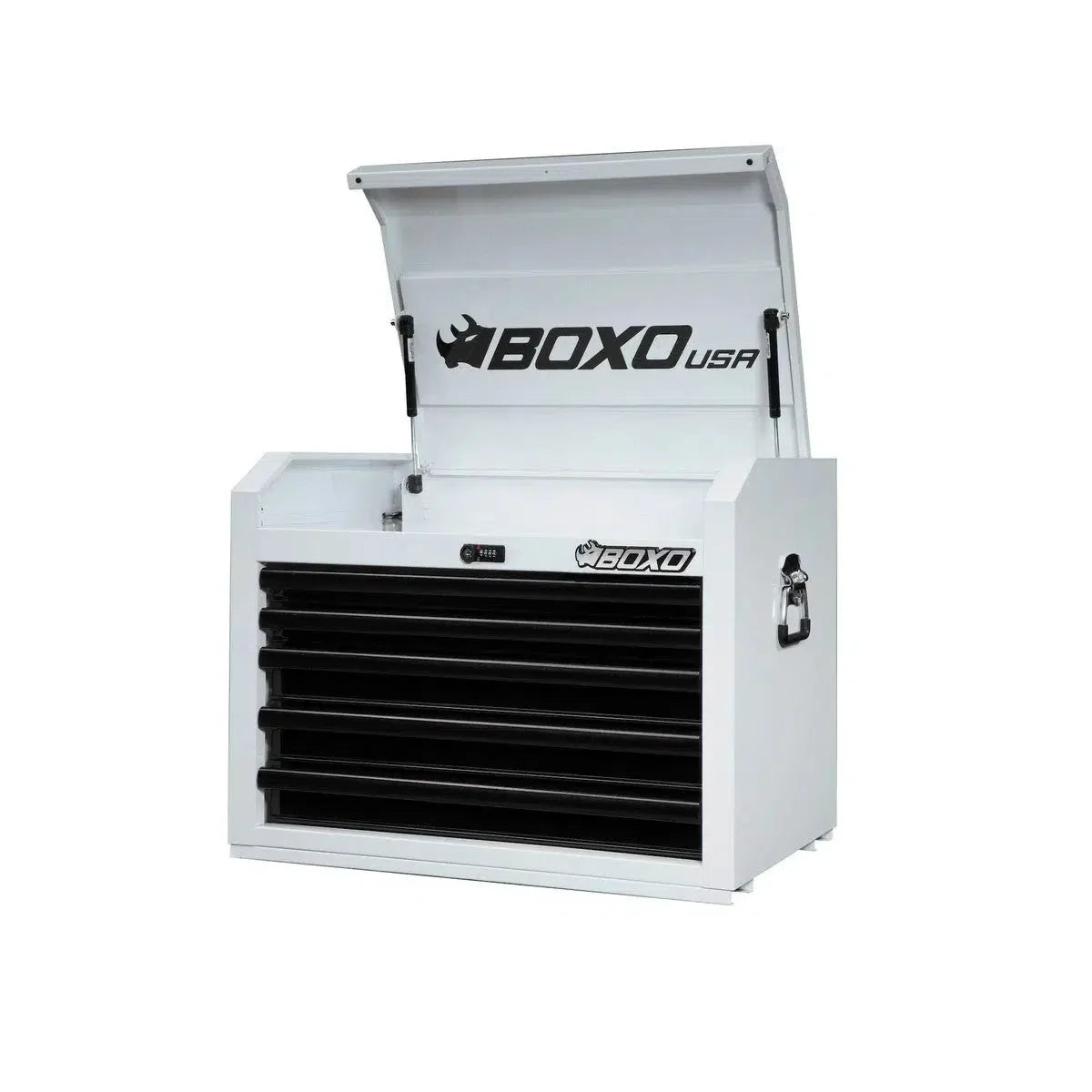 The 26" 5-Drawer top chest drop front lid with full length piano hinge is actuated by two heavy-duty gas struts. Protect your tools with the key lock or digit-lock combination locking system. Full extension drawers come with 100 lbs. steel ball bearing drawer slides. Each box comes with a foam drawer liner kit. Available in either white with black drawers or black with grey drawers. Every Pro Series tool box features a lifetime warranty.