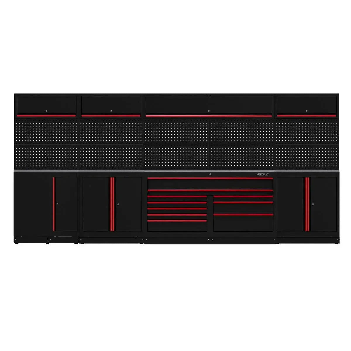 Each cabinet is engineered from heavy-duty 18-gauge steel with a durable textured black powder coat finish. This system is built to withstand demanding shop conditions while maintaining a sleek, professional appearance. The perforated back panels provide convenient vertical storage for frequently used tools and accessories, while fully extending drawers glide effortlessly on heavy-duty steel ball bearing slides with auto-return for smooth and reliable access to every tool.