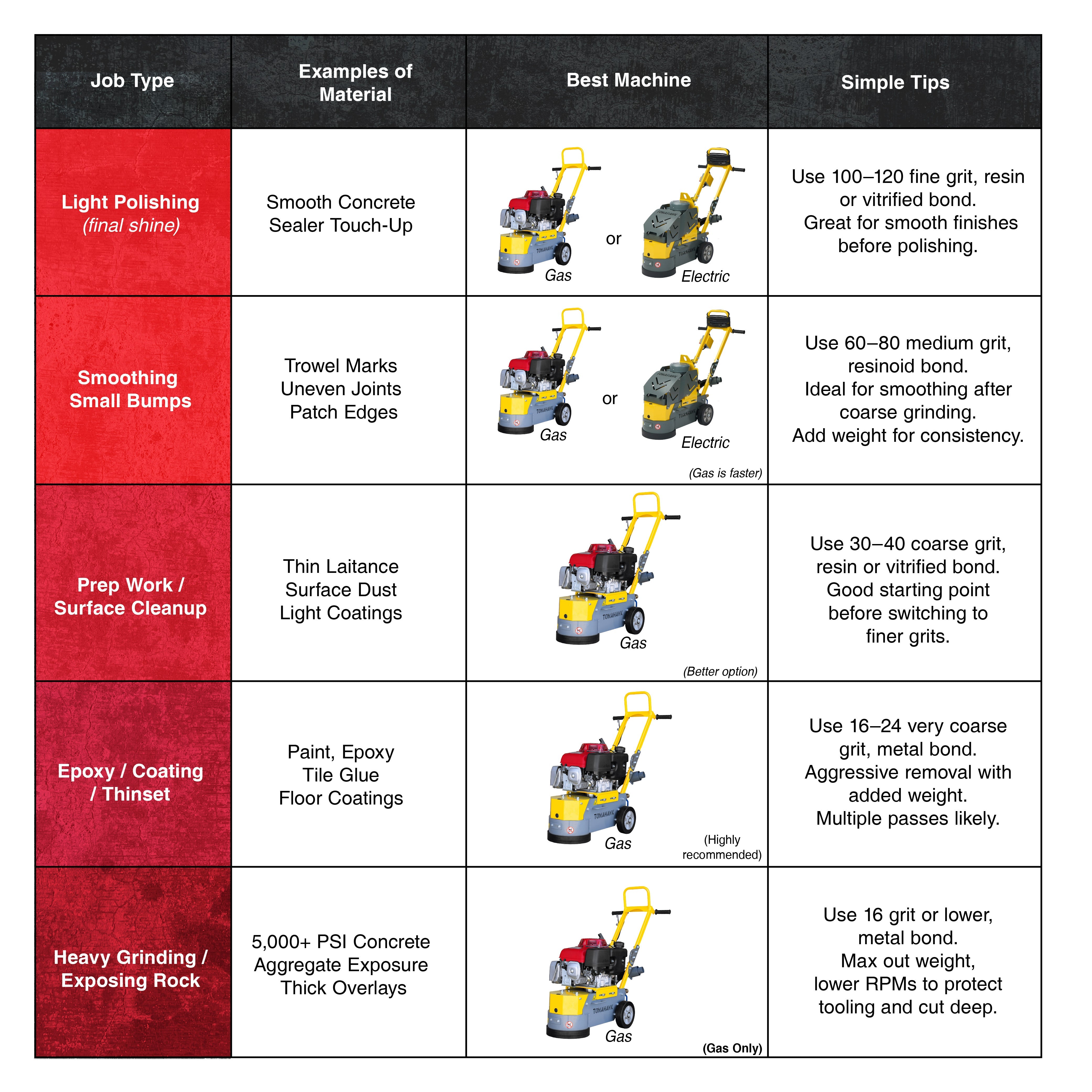 Ideal for prepping concrete before overlays, epoxies, or polishing. Removes old adhesives, sealers, thin-set, paint, and more.