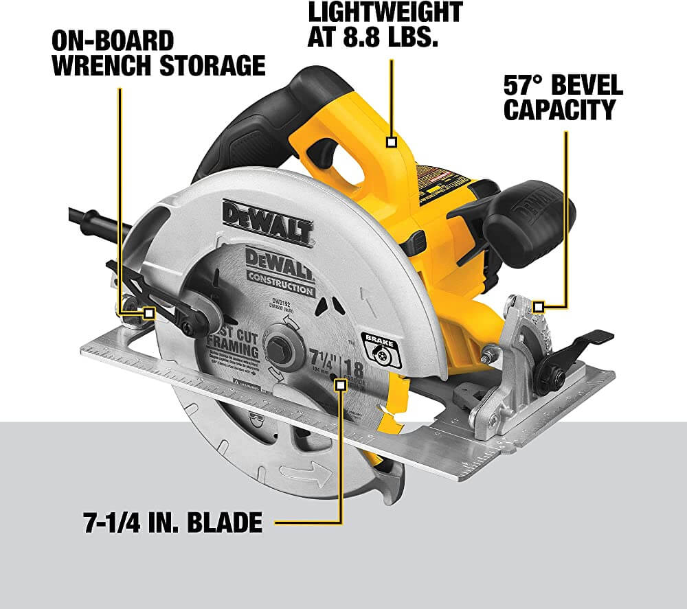 The DWE575 7-1/4 in. Lightweight Circular Saw is among the lightest saws in its class at only 8.8 lbs. 15 Amp motor is powerful enough for the toughest applications and electric brake stops the blade after trigger is released. Bevel capacity of 57° and 2-9/16 in. depth of cut capacity provide versatility.