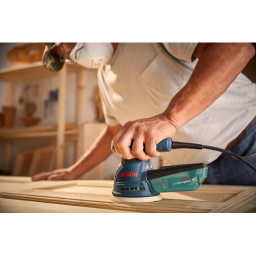 The Bosch ROS20VSC 5 In. Random Orbit Sander/Polisher delivers fast removal and a well-blended, ultra-smooth finish, so woodworkers and finish carpenters can sand quickly and to exacting standards. It is designed to eliminate swirl marks on the workpiece, thanks to an integral pad dampening braking system. Bosch’s hook-and-loop disc attachment ensure firm grip of the disc during use. Additionally, the microcellular backing pad is pliable to ensure a smooth, fine finish on both flat and contoured surfaces alike. With a comfortable soft-grip top and body design, this tool has variable-speed control from between 7,500 and 12,000 OPM to match the speed to the task. It also includes an on-board system for filtering fine dust.