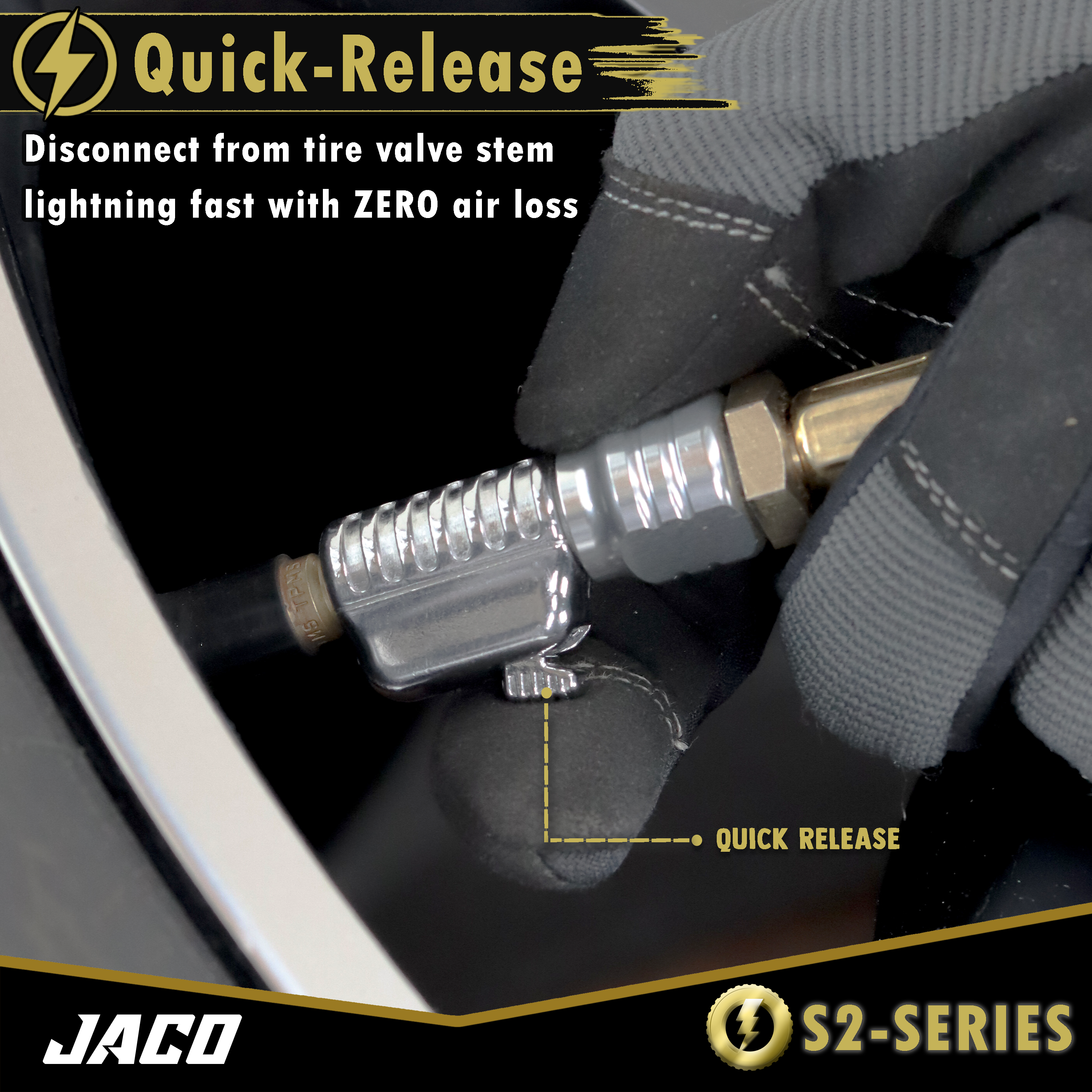Engineered for precision and performance, the Lightning S2-Series tire air chuck features our patented “push-to-lock” quick-connect nozzle that instantly creates a secure, air-tight seal to your tire valve. Built from ultra-durable, lightweight aircraft-grade aluminum alloy, it connects to any standard tire inflator gauge or air hose. The built-in quick-release button allows for rapid detachment from the valve stem with zero air loss — making it the perfect upgrade to any tire inflation air system.