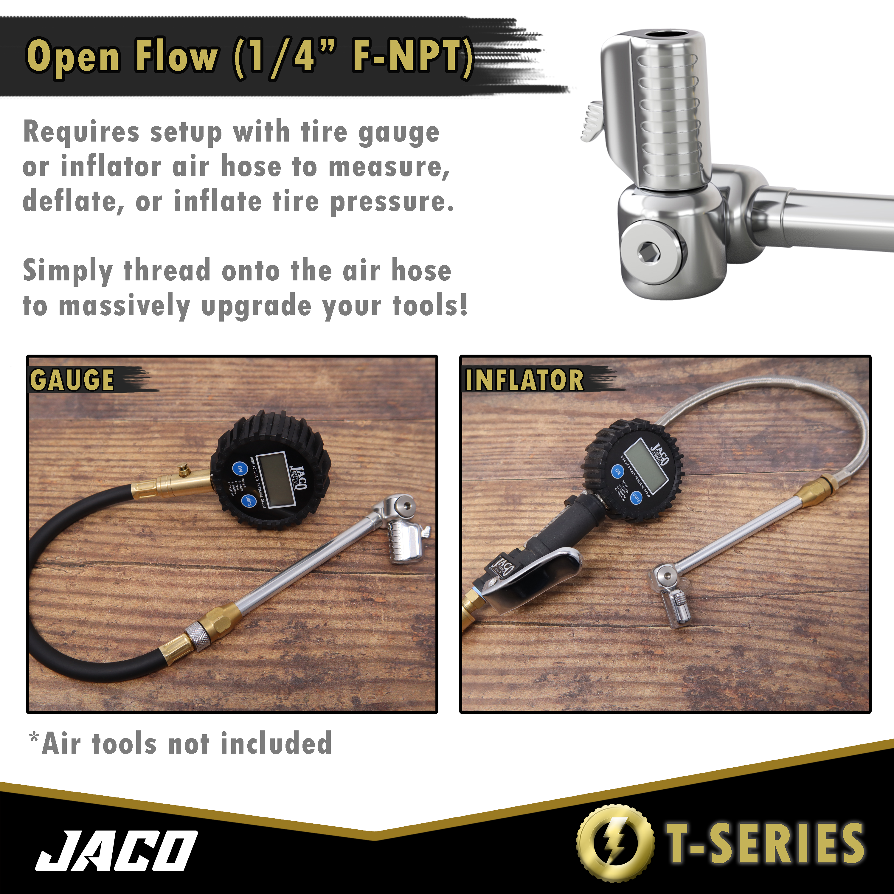 • Open Flow: features high-precision threaded fittings (1/4 inch F-NPT) for quick setup with in-line tire pressure inflators and gauges for superior pressure control during tire inflation maintenance.