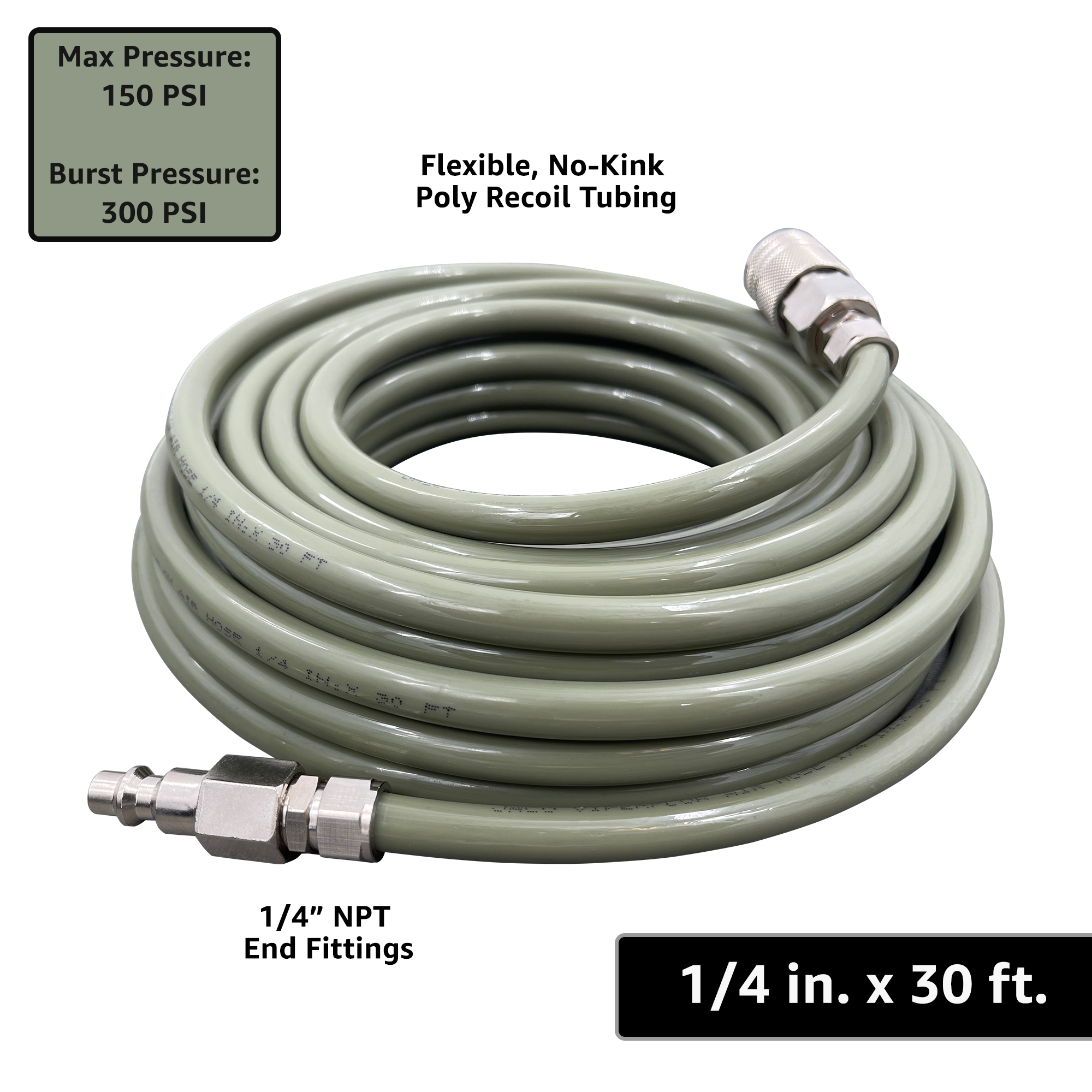 - EASY-TO-USE - using an air hose shouldn't be frustrating. Our poly air hose is easy to move around, and will effortlessly uncoil to any length you need up to 30 feet, and quickly recoil back when the job is done.