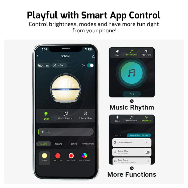 - Diversión con control inteligente de la app: Controla el brillo, los modos y disfruta de funciones interactivas como juegos de golpear topos, control grupal de hasta 100 esferas, temporizadores de cuenta regresiva y sincronización de música directamente desde tu teléfono. Enlace de descarga: App Store (iOS) o Google Play (Android).