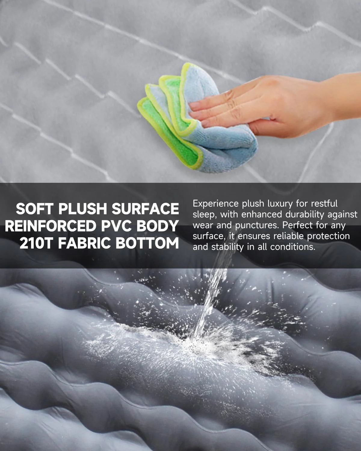 Premium Material: Our air mattress features thickened PVC fabric, ensuring exceptional durability and leak-proof performance. Enhanced with a plush velvety surface, it offers a comfortable touch and maintains waterproof quality. Whether for outdoor camping or indoor use, it provides reliable comfort and peace of mind.