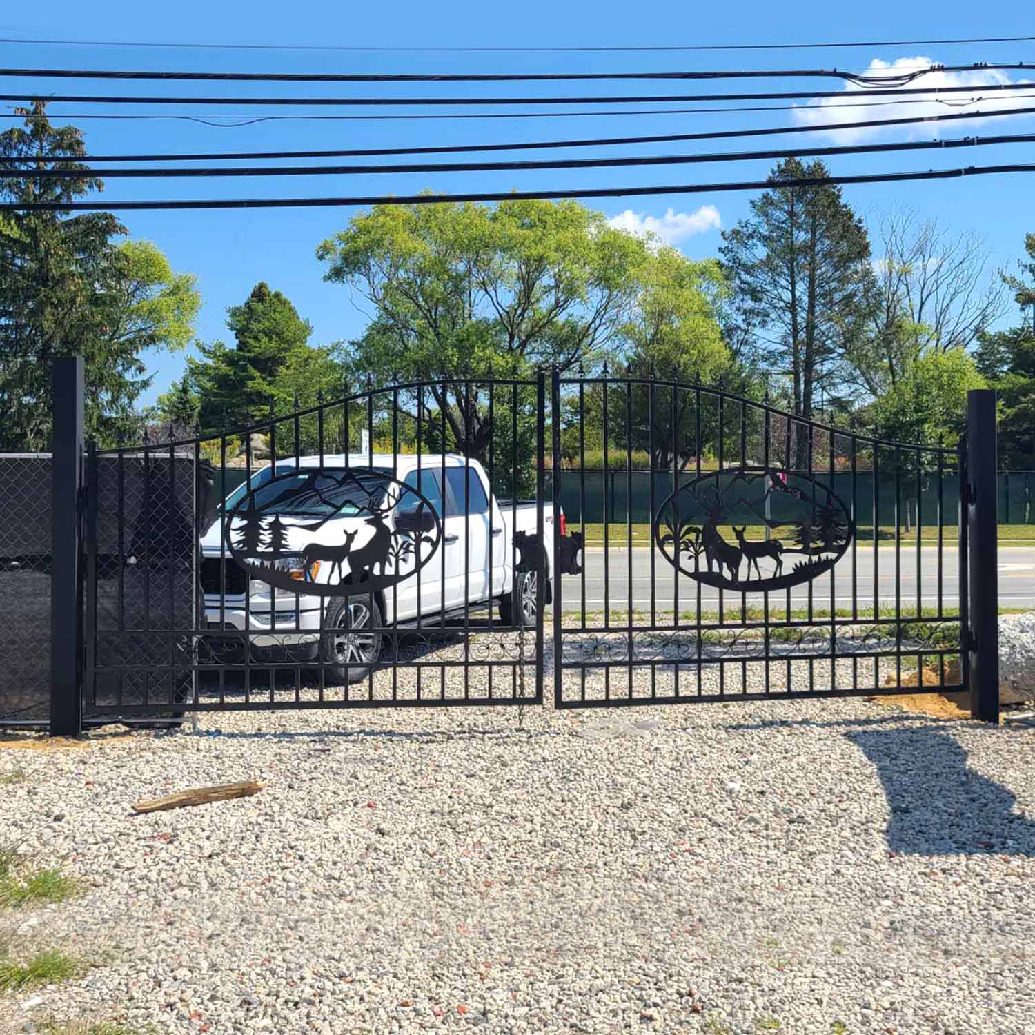 - 20ft Bi-Parting Wrought Iron Gate. With artwork "Deer" in the Middle of the Gate Frame.