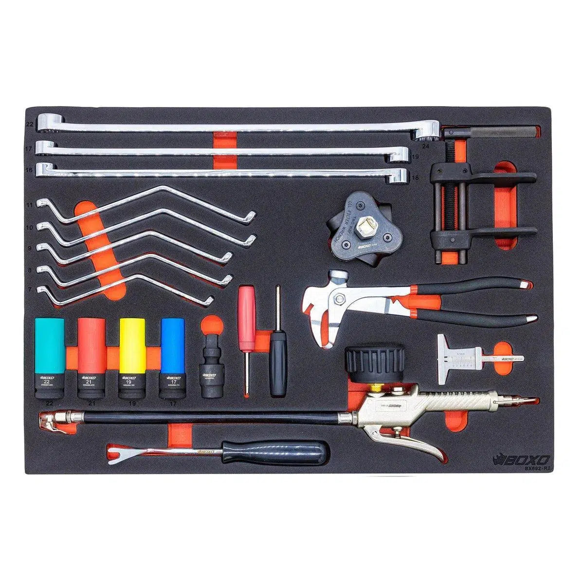 No busque más: BOXOusa es el juego de herramientas básico perfecto de 21 piezas para mecánicos principiantes o principiantes. Sin embargo, no se deje engañar, este juego de herramientas es apto para mecánicos de cualquier nivel. Cubrimos todas las necesidades básicas para cambiar aceite, desmontar y balancear neumáticos, ajustar la alineación, purgar y realizar el mantenimiento de frenos. Este juego viene en nuestra espuma EVA de 3/3 de tamaño completo y cabe perfectamente en nuestras cajas de herramientas Pro-Series. Este juego básico incluye algunas de las herramientas más comunes para comenzar a reparar vehículos.