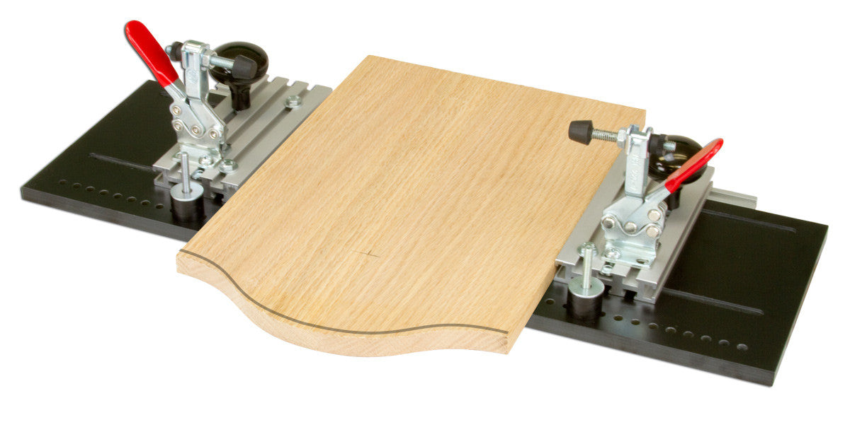 - Dispositivo patentado que proporciona una plataforma de trabajo segura y fácil de controlar. Úselo con nuestras plantillas de puerta HD o estándar (se venden por separado) en su mesa de perfiladora o fresadora.