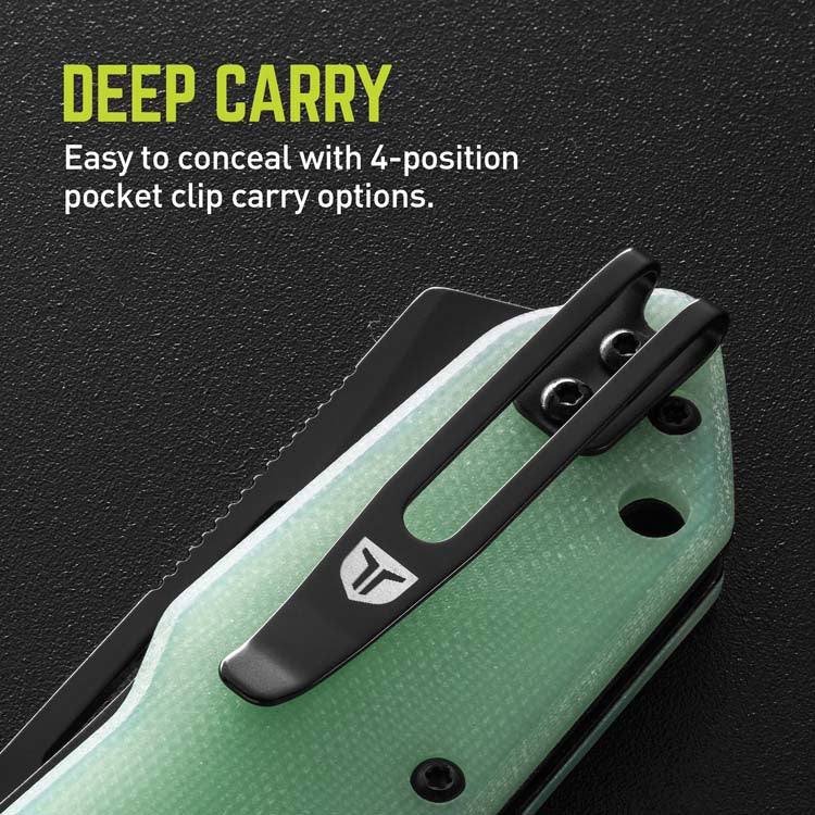 El clip de bolsillo de transporte profundo oculta fácilmente el cuchillo y la configuración de 4 posiciones le permite llevar el cuchillo en una posición con la punta hacia arriba o hacia abajo para diestros, así como en una posición con la punta hacia abajo o hacia zurdos según su preferencia personal.