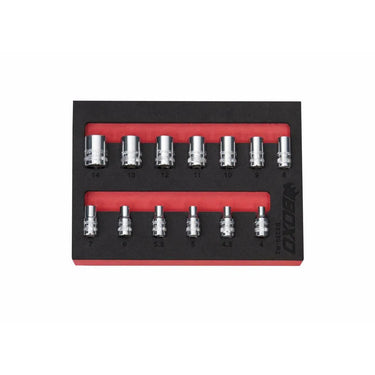 13 Pc 1/4" Dr Metric Standard Length 6 Pt Chrome Socket Set Includes: 4, 4.5, 5, 5.5, 6, 7, 8, 9, 10, 11, 12, 13 & 14mm Sockets. Modular EVA Foam 1/9th Drawer Tool Organization Insert Included.