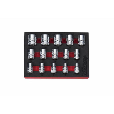 15 Pc 3/8" Dr Metric Standard Length 6 Pt Chrome Socket Set Includes: 7, 8, 9, 10, 11, 12, 13, 14, 15, 16, 17, 18, 19, 20 & 21mm Sockets. Modular EVA Foam 1/9th Drawer Tool Organization Insert Included.