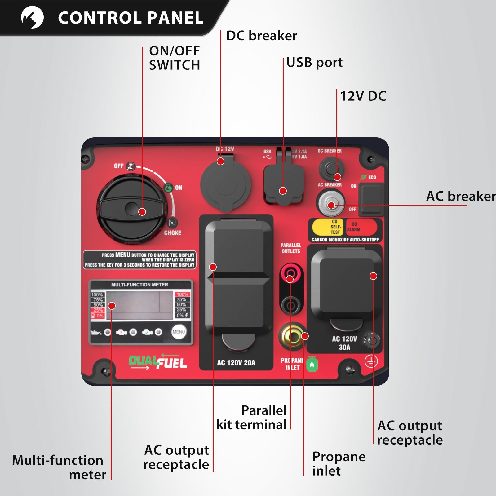 - Smart Display – 5-in-1 panel shows voltage, frequency, hours, fuel level, and output.