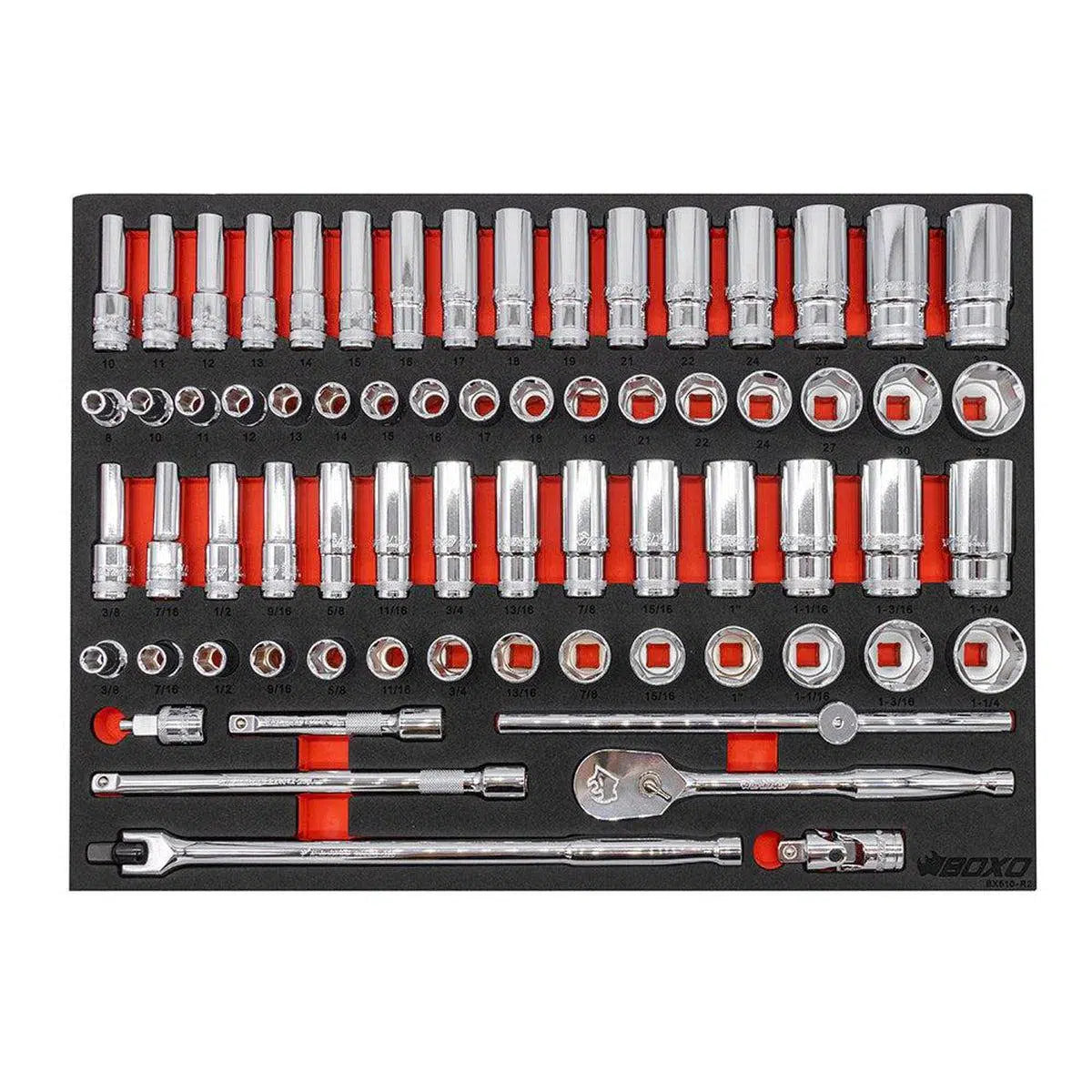 BoxoUSA 68-Piece 1/2" Drive 6-Point Metric & SAE Master Chrome Socket Set | 3/3rd EVA Foam BX510-R2 BoxoUSA 68-Piece 1/2" Drive 6-Point Metric & SAE Master Chrome Socket Set | 3/3rd EVA Foam BX510-R2