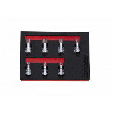 7 Piece 3/8" Drive Super Stubby Spline Bit Socket Set Includes: M4, M5, M6, M7, M8, M10 & M12 Bit Sockets. Modular 1/9th EVA foam tool storage solution insert included.