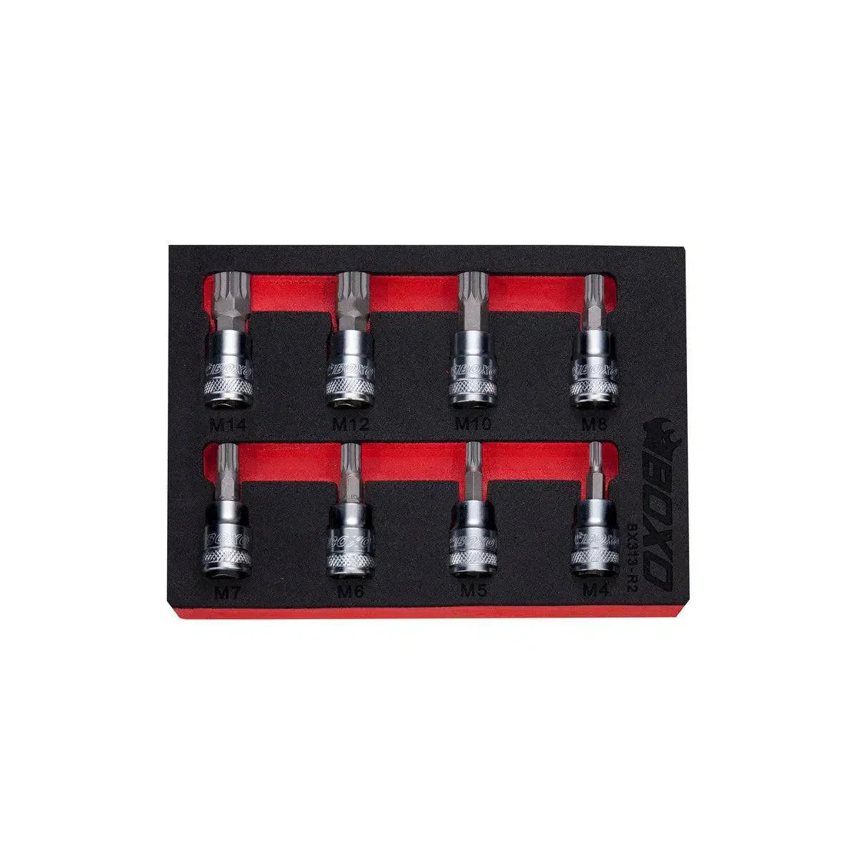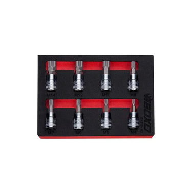 8-Piece 3/8" Drive Spline Bit Socket Set Includes: M4, M5, M6, M7, M8, M10, M12, M14 Spline Bits. Sockets are Secured in 1/9 Drawer EVA foam tool storage solution insert..