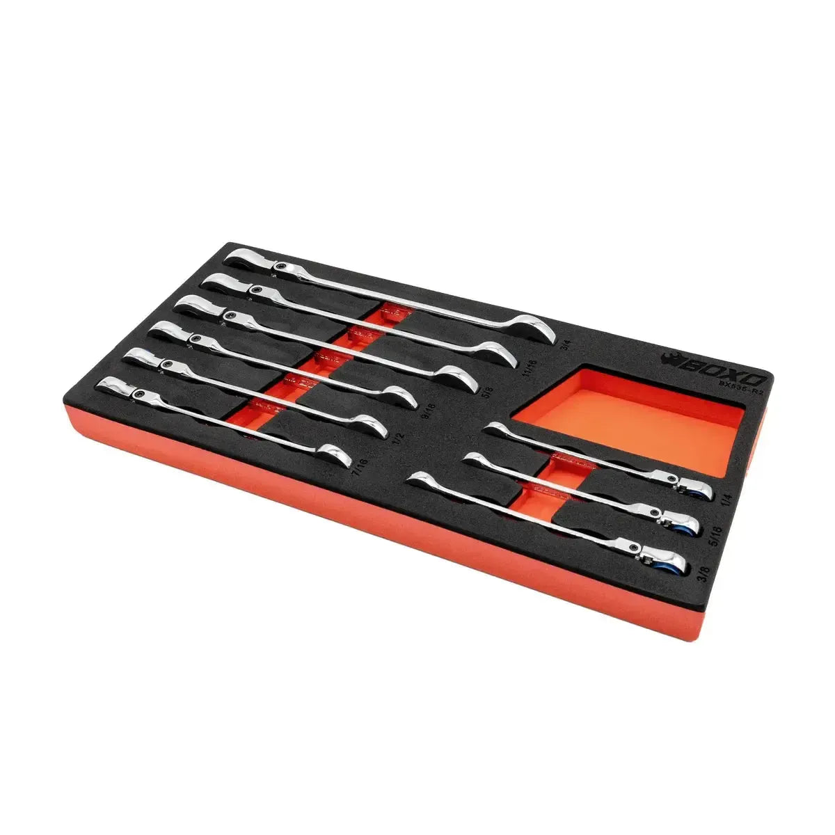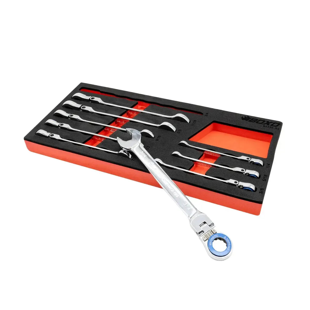 BoxoUSA 9-Piece Flex Head 100T SAE Ratcheting Combination Wrench Set with Magnetic Stop Ring and Grip Open End | 1/3rd EVA Foam BX535-R2 BoxoUSA 9-Piece Flex Head 100T SAE Ratcheting Combination Wrench Set with Magnetic Stop Ring and Grip Open End | 1/3rd EVA Foam BX535-R2