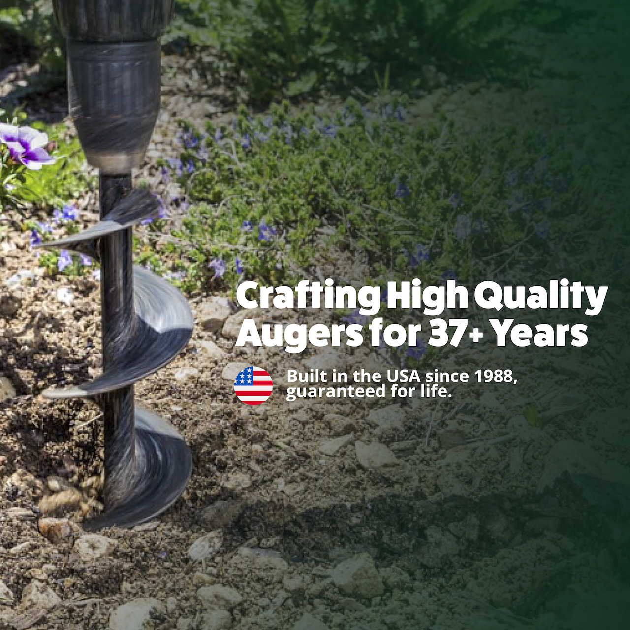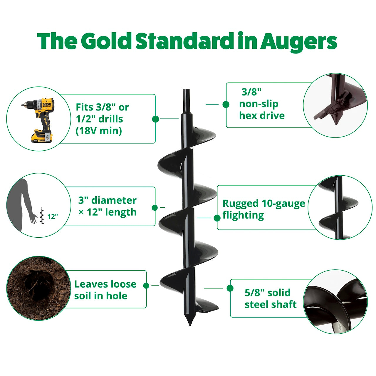 The DIY Guru Auger measures 3 inches in diameter by 12 inches long. It has been designed to leave a small amount of loose soil in the bottom of the hole when digging to help a new plant to start growing. The garden drill auger features rugged, 10-gauge flighting, a 3/8-inch non-slip hex drive, and it is painted a glossy black enamel. It also includes a 5/8-inch center shaft made completely from solid steel.