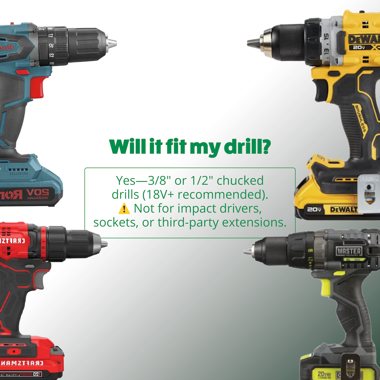 - Compatible with all standard 18V or larger chucked drills (a graphic of a chuck would be valuable)