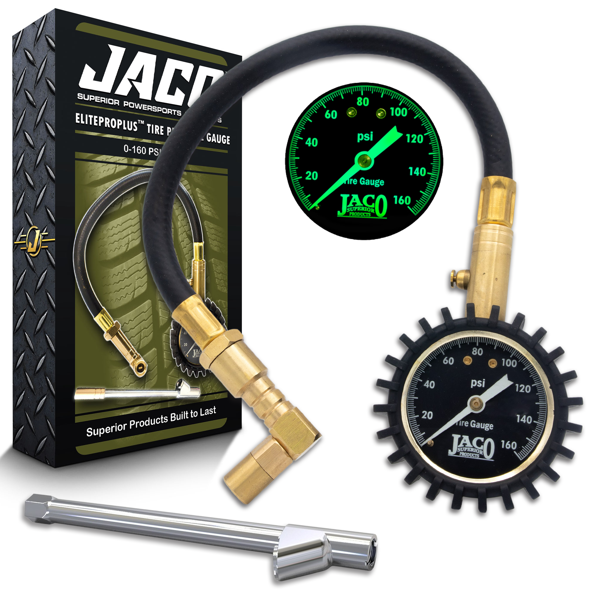 - Larger, 2" glow-in-dark dial features easy-to-read 160 PSI scale that glows in the dark, providing accurate readings that "lock" onto the dial until the pressure reset valve on the brass stem is pressed to reset reading to zero.