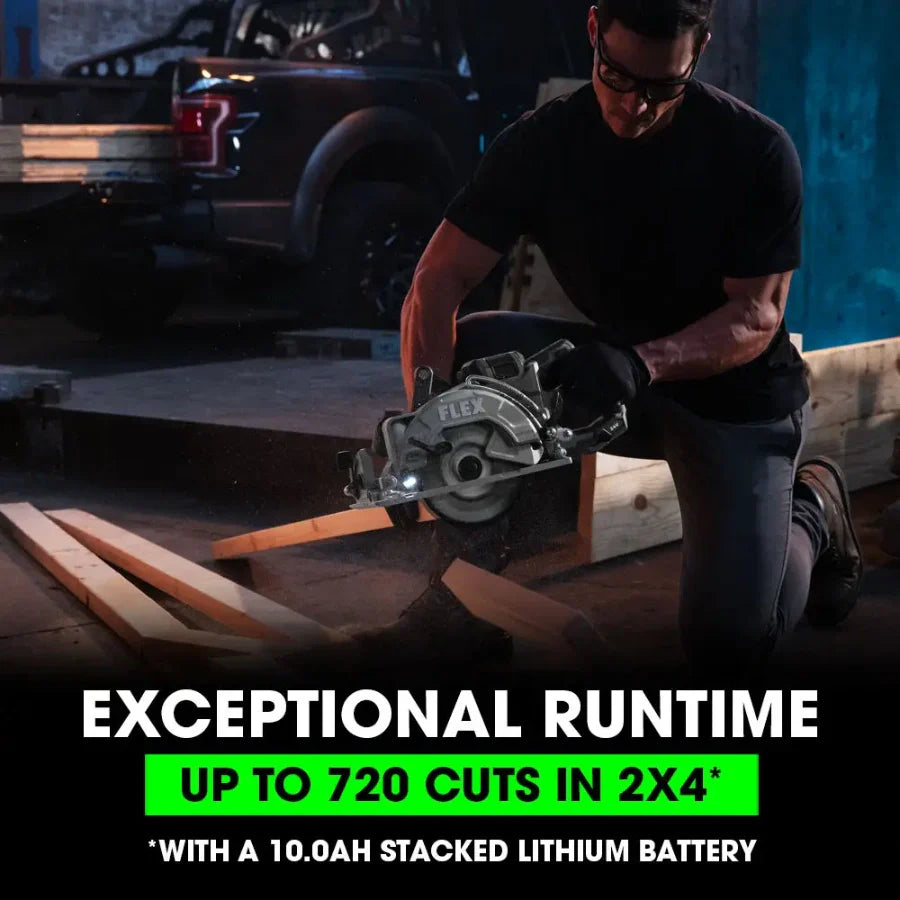 Rip through miles of 2x4s with the FLEX 24V Brushless 7-1/4" Rear Handle Circular Saw. Both lightweight and durable, this precision cutting tool is a control freak, positioning the blade to the left of the motor and placing the handle at the rear to optimize line of sight. Built for advanced cutting performance and ultimate cutting capacity (up to 2-5/8"). Built-in LED light illuminates workpiece providing superior precision and accurate cuts. This saw's powerful motor is maximized by the FLEX Stacked Lithium Advantage: unmatched 24V battery power, runtime, and fast charging speed. Protected by the FLEX Limited Lifetime Warranty when registered within 30 days of purchase at registermyFLEX.com through December 31, 2024.