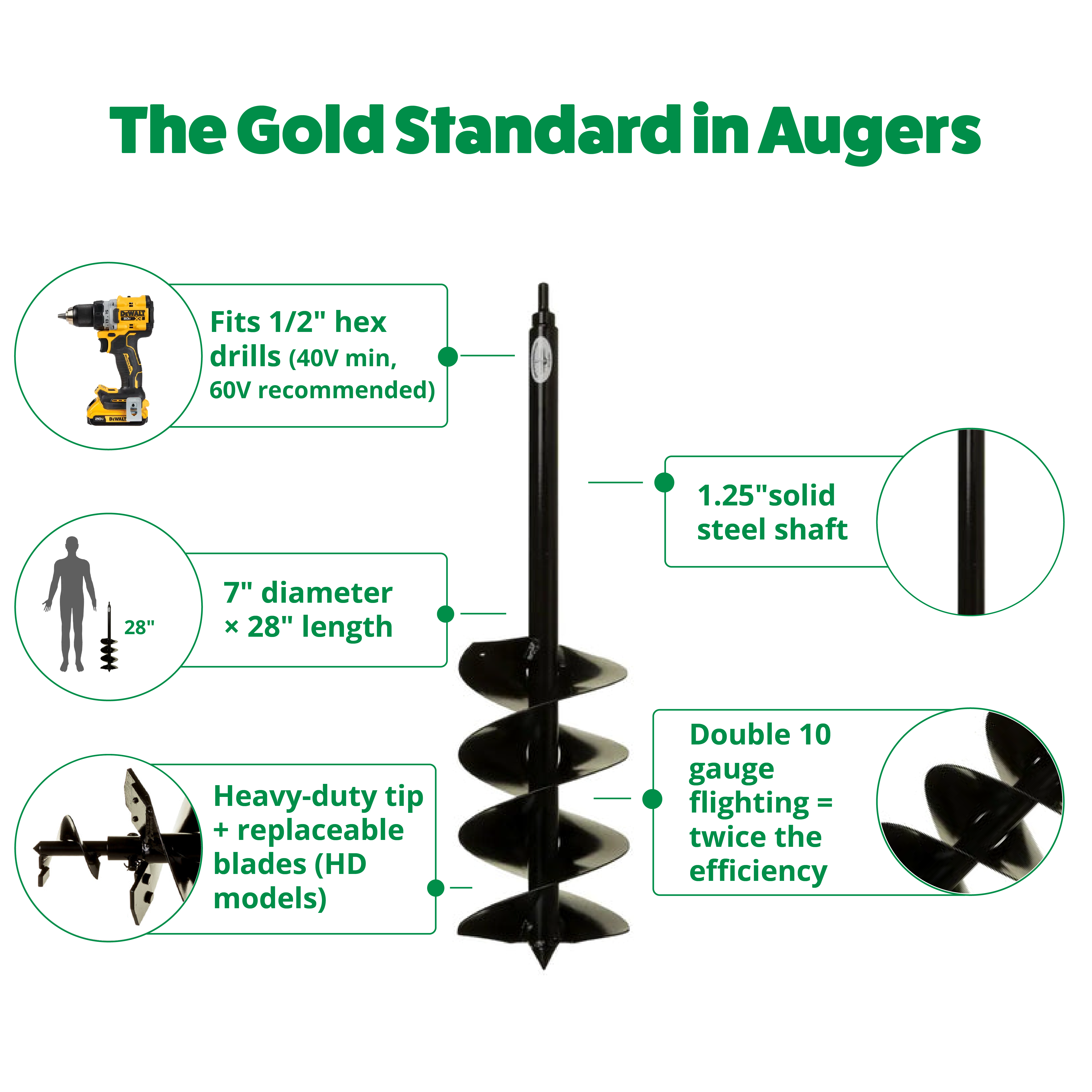Heavy Duty is the most rugged and versatile option for the gallon pot & post hole auger. Use the dropdown menu above to choose the “Heavy Duty – Clay, Rocky, or Professional Use” option. The heavy-duty digging tip is a replaceable auger tip that will help you tackle the most challenging digging tasks without damaging the main auger. The leading portion of the digging tip has replaceable auger blades (included with purchase). With the heavy-duty version of the gallon & post hole auger, you can complete tasks that would put other tools into early retirement.