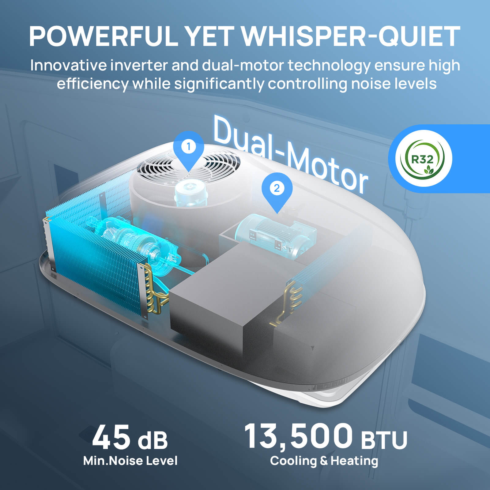 The TURBRO RV air conditioner with heat pump provides 13,500 BTU of cooling and heating power for year-round comfort. It features inverter technology for efficient operation and ultra-quiet performance at just 45 dB. With a sleek design, app control, and mood lighting, it's ideal for RVs, campers, and food trucks. Fits 14.25" x 14.25" roof openings.