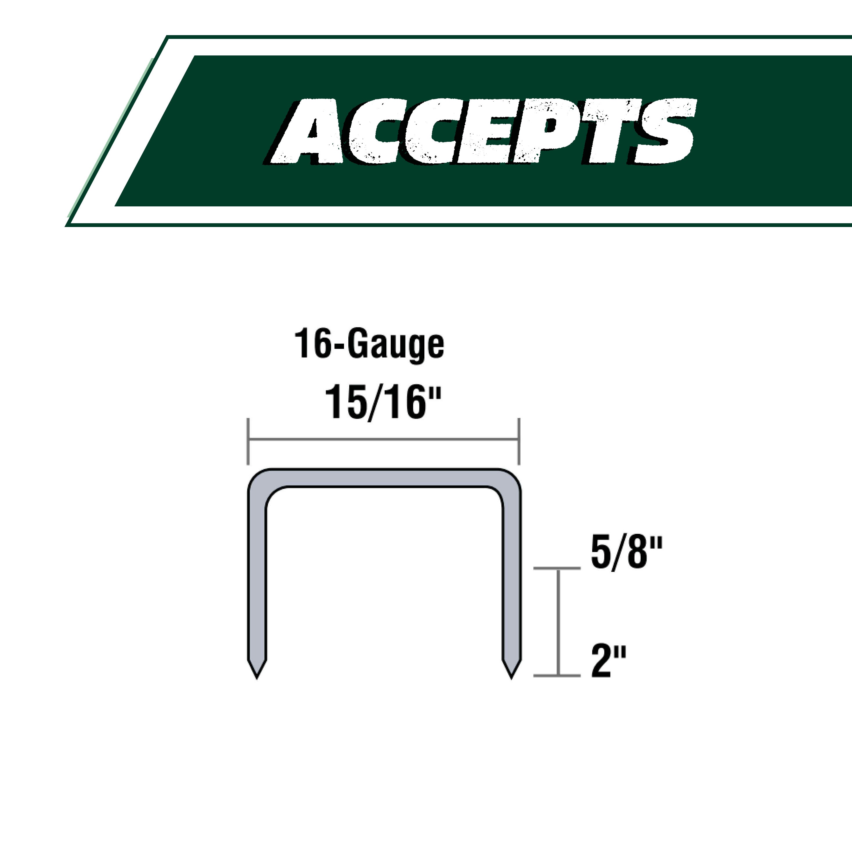 Weight: 4.7 lbsFASTENERS: Uses wide 15/16 Inch crown staples from 5/8 inch - 2 inch in length