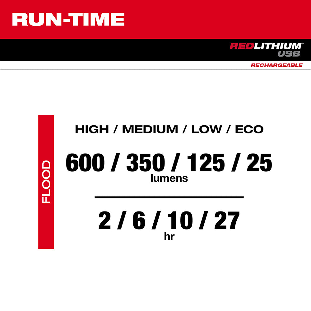 • 4 light output modes: Flood High mode: 600-Lumens- 2 hours; Medium mode: 350-Lumens- 6 hours; Low mode: 125 -Lumens- 10 hours; Eco mode: 25-Lumens- 27 hours
