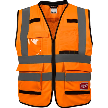 Our ANSI Type R Class 2 High Visibility Performance Safety Vests are designed to carry more. These hi-vis safety vests have 15 pockets, including a clear ID holder, a rear tablet pocket, and three internal pockets that provide you with added storage. The front pockets are reinforced with durable 600D tear-resistant materials to withstand rough jobsite conditions. Milwaukee incorporated a comfortable padded collar to reduce pressure around your neck. The quick internal size adjustment creates a better fit for you, allowing our MILWAUKEE® adjustable safety vests to be worn in the summer over a t-shirt or in the winter over a jacket. Class 2 high visibility safety reflective vests are recommended when working in environments with traffic traveling under 50 mph or when working around heavy machinery. This includes construction, road construction, traffic direction, utility crews, and survey crews. Yellow or orange safety vests color options are available, as well as vests with CSA compliance. These safety vests are customizable by adding your logo.