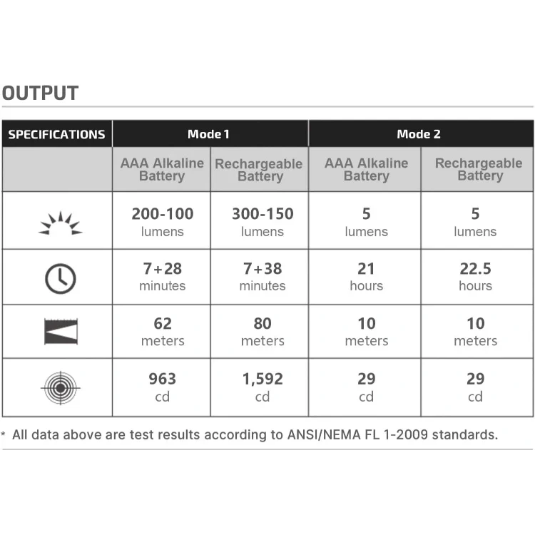 | Max Output | 200 lumens (300 lumens if using a rechargeable battery) |