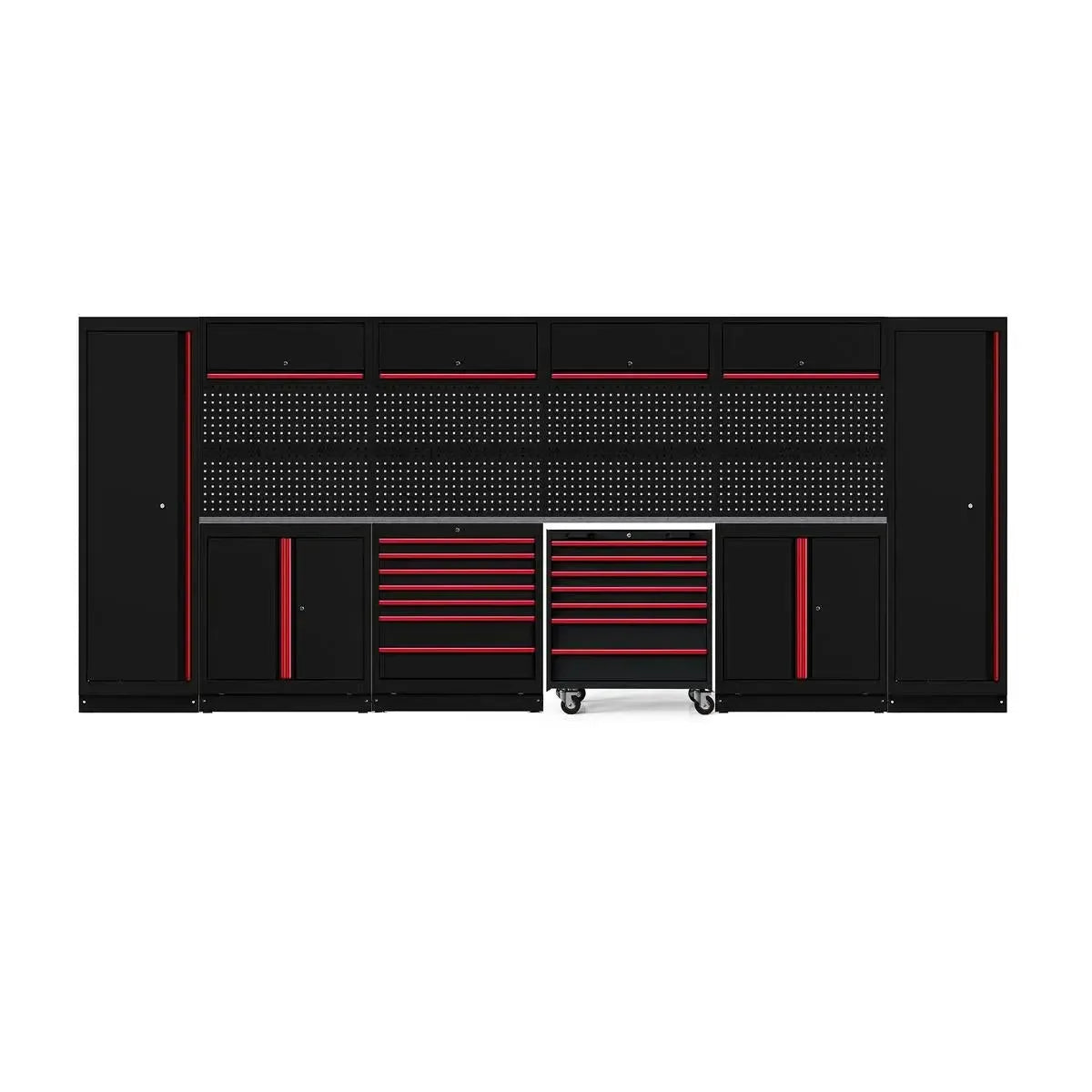 Each cabinet is engineered from heavy-duty 18-gauge steel with a durable textured black powder coat finish. This system is built to withstand demanding shop conditions while maintaining a sleek, professional appearance. The perforated back panels provide convenient vertical storage for frequently used tools and accessories, while fully extending drawers glide effortlessly on heavy-duty steel ball bearing slides with auto-return for smooth and reliable access to every tool.