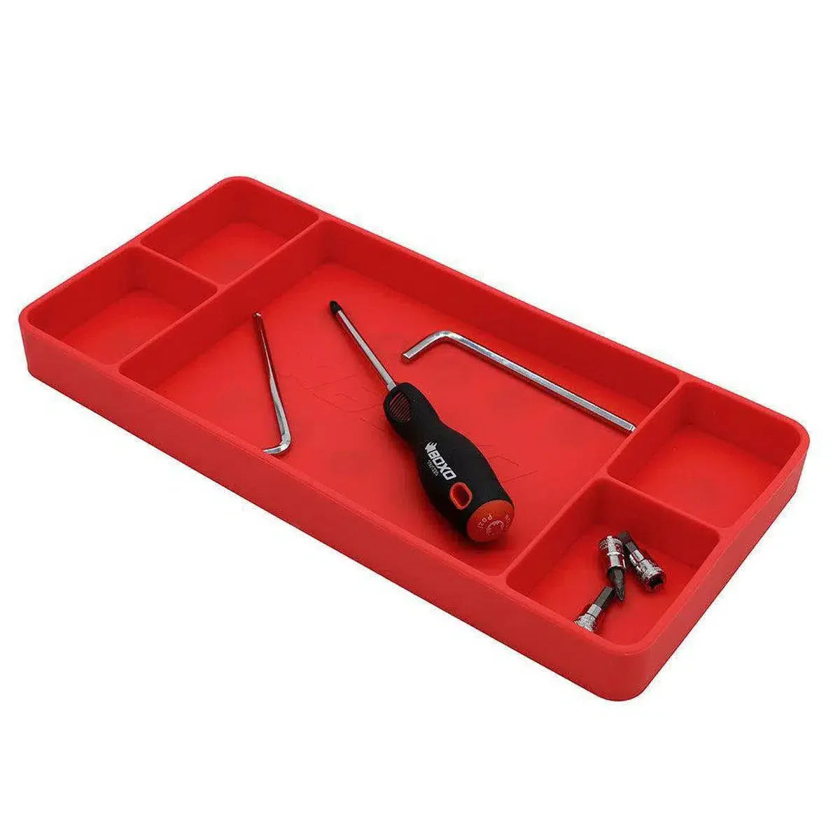 The new BoxoUSA, red magnetic silicon tool tray with 14 magnets to  hold tools and tray in place. The non-slip flexible tray provides a  multitude of applications to keep tools and materials close by when making repairs. Flexible material prevents scratches to metal surfaces. With 5 individual compartments easily store screws, nuts and bolts in smaller compartments, and larger items in the center, like screwdrivers and wrenches.
