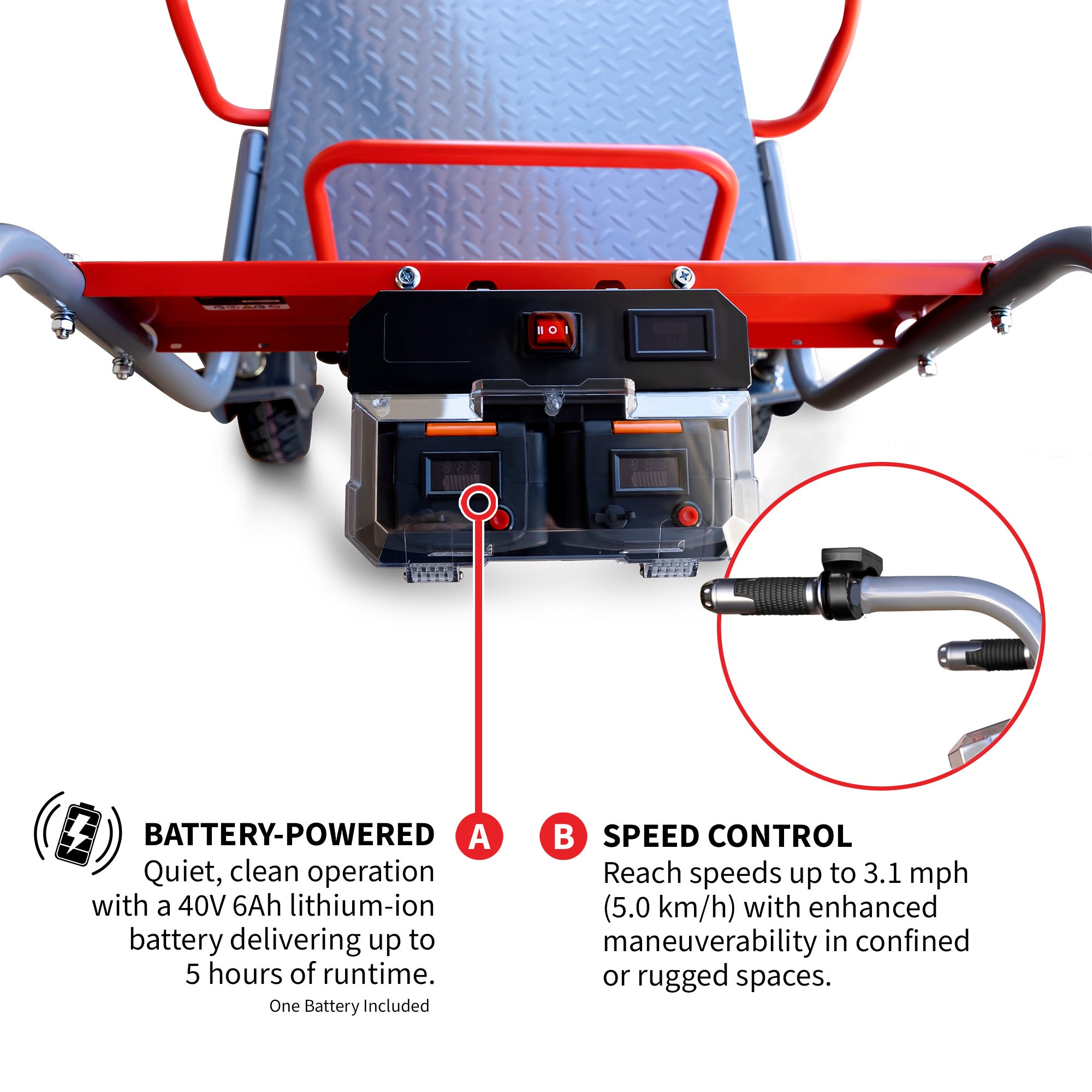 Featuring a heavy-duty rubber track undercarriage, this battery-powered cart evenly distributes weight to reduce ground disturbance while maintaining traction across mud, sand, gravel, or wet conditions. It outperforms wheeled carts in stability and efficiency, saving time, energy, and labor costs every day on the job.